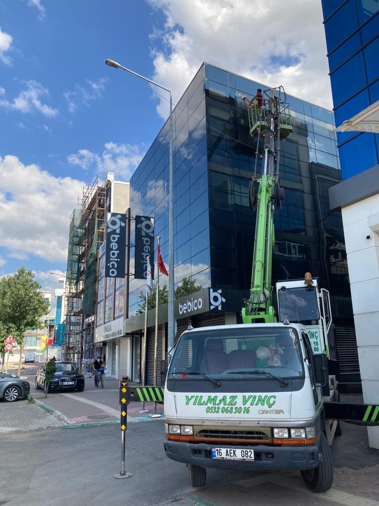 Bursa Nilüfer ilçesinde Kiralık sepetli vinç hizmetlerimiz devam ediyor. Bugün tabela montaj isi yapıyoruz. Bu ve buna benzer işleriniz için Yılmaz Vinç Bursa uygun fiyat ve kalitemiz ile her zaman yanınızda. Tel: 0 531 295 69 60 ; 0 532 068 30 16